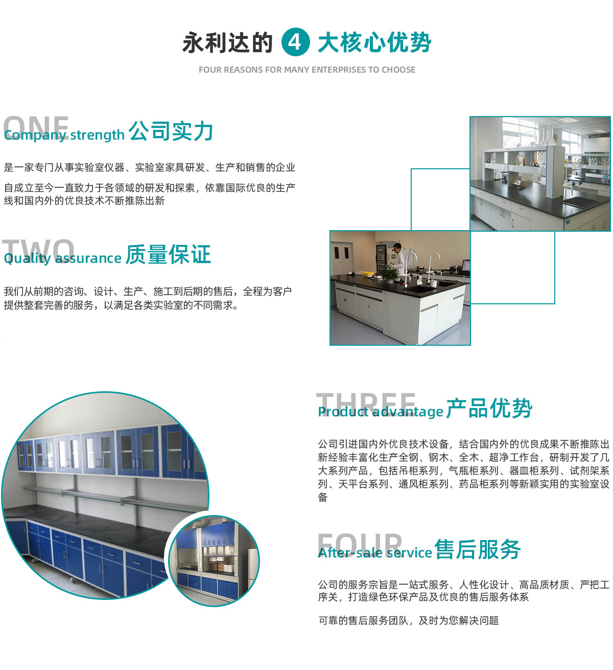 天津永利達實驗室設(shè)備有限公司是一家從事實驗室家具研發(fā)、生 產(chǎn)、銷售與服務(wù)于一體的企業(yè)。成立于2006年,坐落于天津市靜海高新產(chǎn)業(yè)園區(qū)。公司秉承“科技創(chuàng)新、質(zhì)量為本、服務(wù)至上”的理念,致力于為用戶提供實驗室家具和整體解決方案。 公司的主要業(yè)務(wù)涵蓋了實驗室家具、實驗室通風、凈化、集中供氣、純水及裝修等多個領(lǐng)域,憑借多年在實驗室行業(yè)的積累,和不斷吸收國際上的技術(shù)與設(shè)計理念,我們從前期的咨詢、設(shè)計、生產(chǎn)、施工到后期的售后,全程為客戶提供整套完善的服務(wù),以滿足各類實驗室的不同需求。 公司的服務(wù)宗旨是 提供人性化設(shè)計、材質(zhì)、嚴把工序關(guān),打造綠色環(huán)保產(chǎn)品及完善的售后服務(wù)體系。